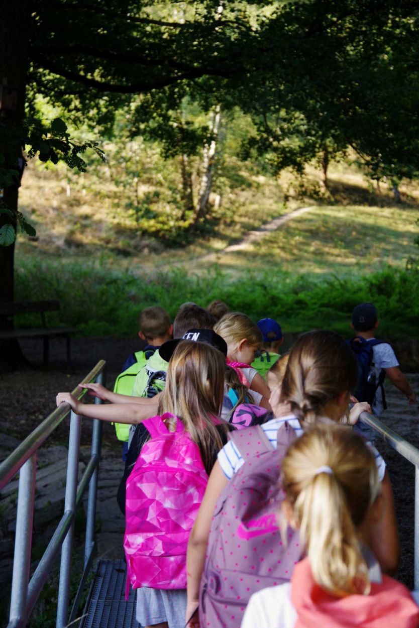 großes, naturnahes Schulgeländegelände mit Spielgeräten und Schulgarten